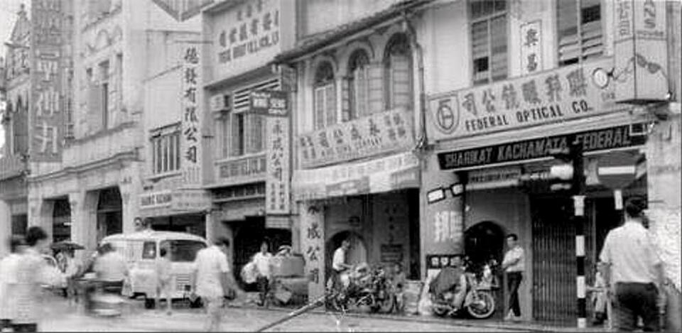 1960 High Street - Jalan Tun HS Lee. Di sebelah kiri adalah pejabat utama Eu Yan San, Dewan Perubatan Cina lama ditubuhkan dan masih di tapak yang sama hari ini. Jauh di jalan adalah Bank Bangkok.